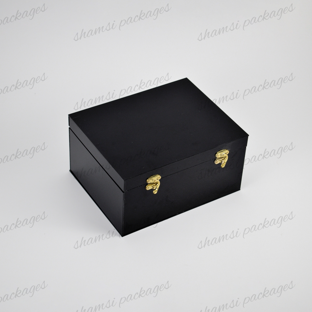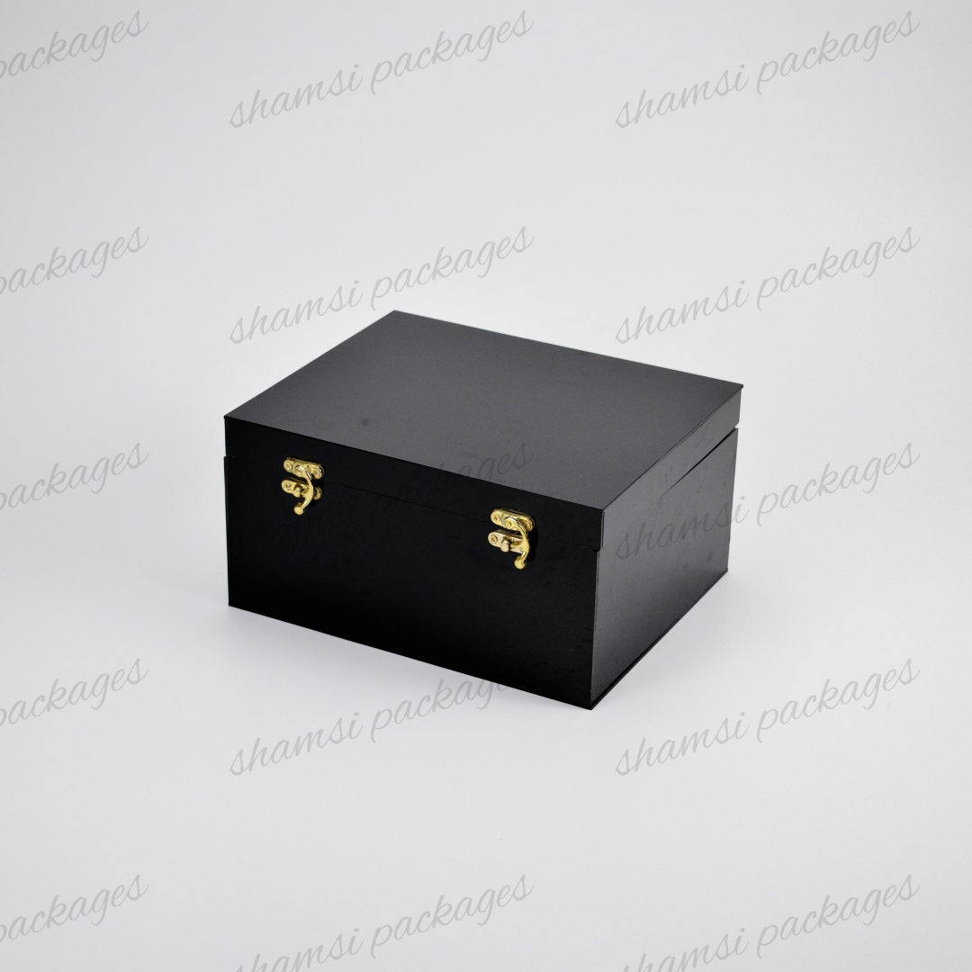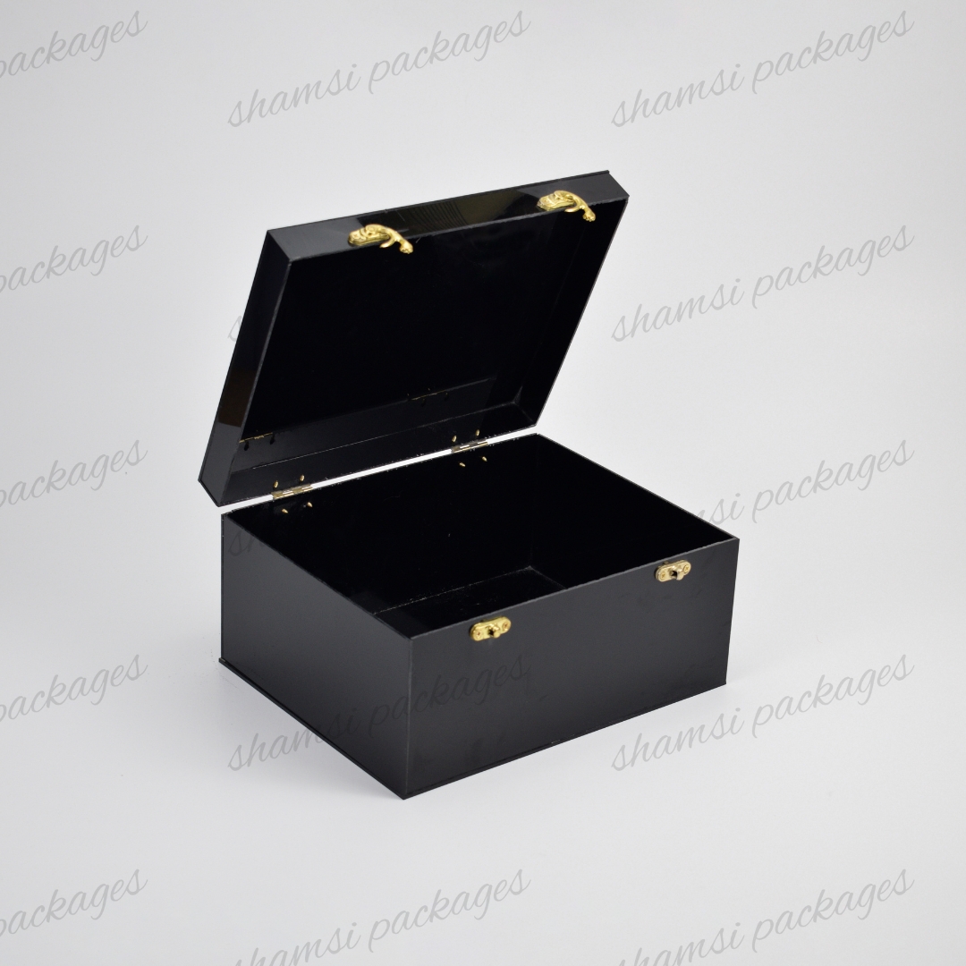 Showcase your most cherished gifts with confidence and style. Our Black Acrylic Hook Box is the ideal choice for presenting items with both security and sophistication. Crafted entirely from premium matte black acrylic, this box delivers a bold, elegant, and modern look.Designed for maximum protection, it features double anker locks on the front, offering a strong and reliable closure. The back is equipped with two sturdy hook supporters, securely connecting the upper black acrylic lid to the bottom base for smooth opening and closing. The spacious interior is perfect for holding Umrah Tabarruk, jewelry, small gifts, watches, sweet items, or any other valuable keepsakes. Its solid, opaque design adds an element of mystery, making the unboxing moment even more special. A refined and durable presentation solution, this box brings luxury, strength, and timeless charm to every occasion.