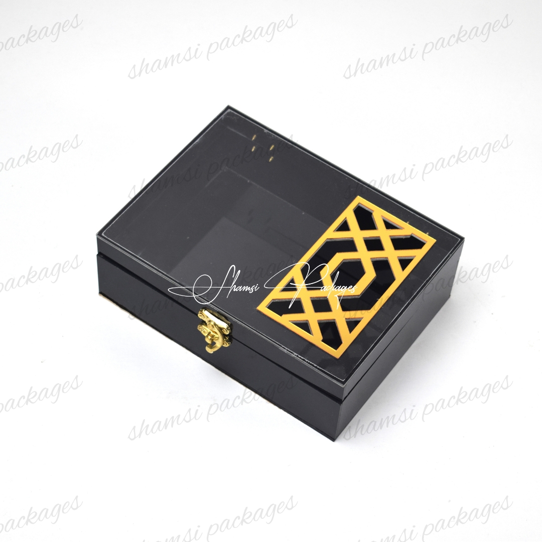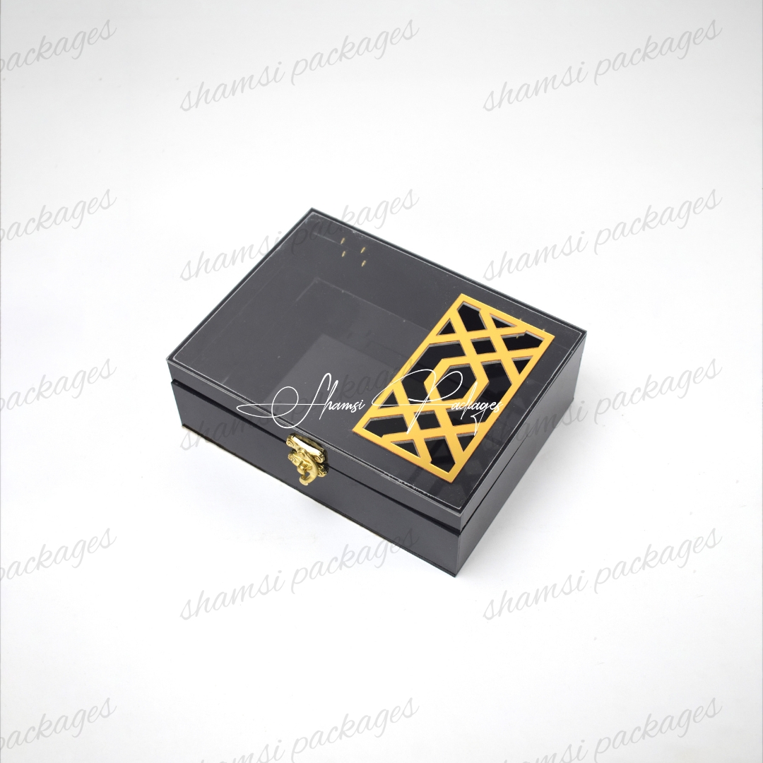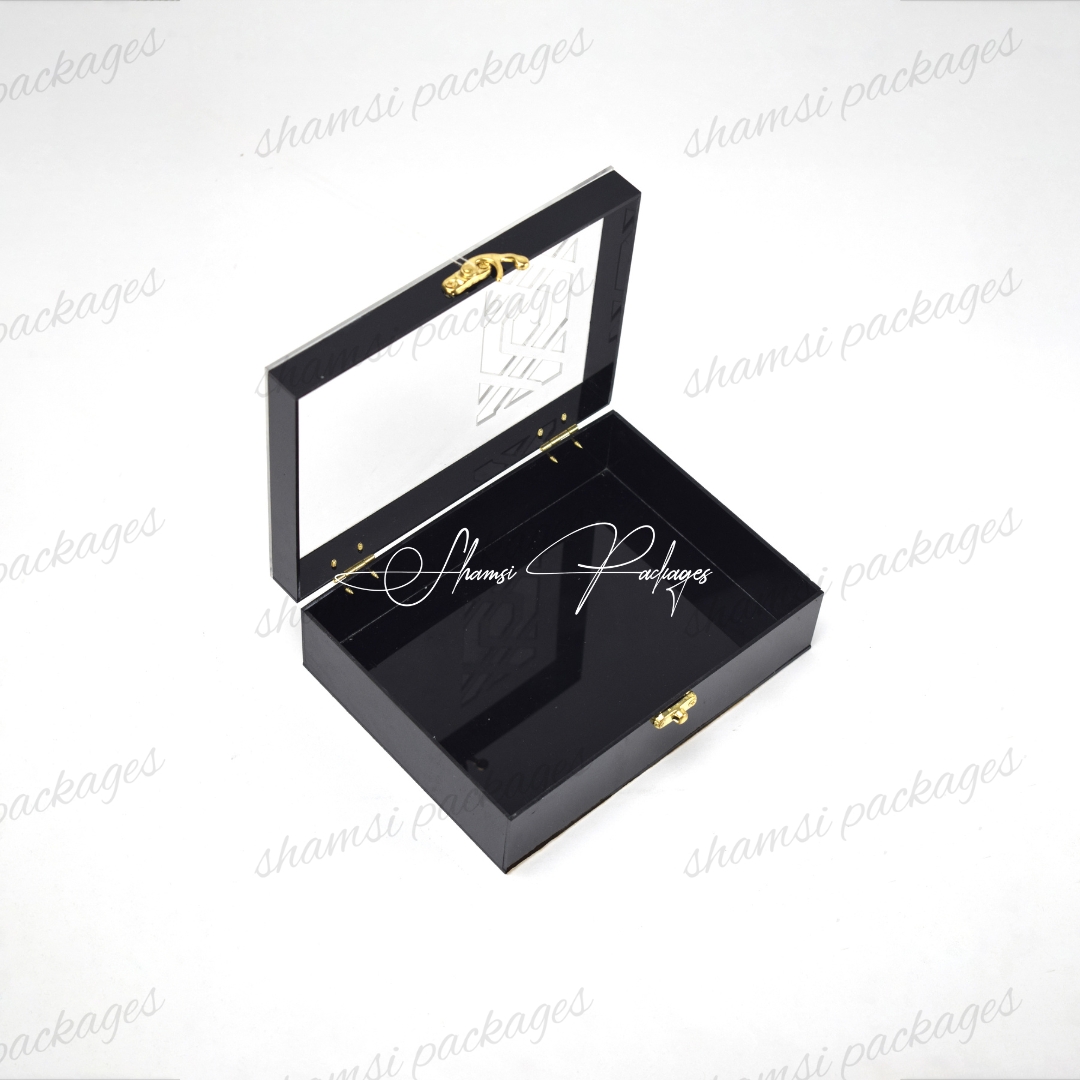Present your gifts with unmatched elegance using our Premium Acrylic Luxury Hook Box, expertly crafted to elevate every special moment. The box features a sleek black acrylic base paired with a transparent acrylic top, allowing a clear view of the items inside. A beautifully designed golden acrylic textured pattern adds a luxurious touch, making this box a true statement piece.Perfectly suited for showcasing Hajj & Umrah Tabarruk, sweet items, jewelry, premium gifts, and other cherished keepsakes, this box blends functionality with sophistication. The golden front lock enhances its premium appeal, while the dual back lock supporters ensure secure and stable closure.Ideal for your product listings under both Acrylic Hook Box and Acrylic Luxury Box categories, this piece brings modern elegance, durability, and premium presentation into one refined design.