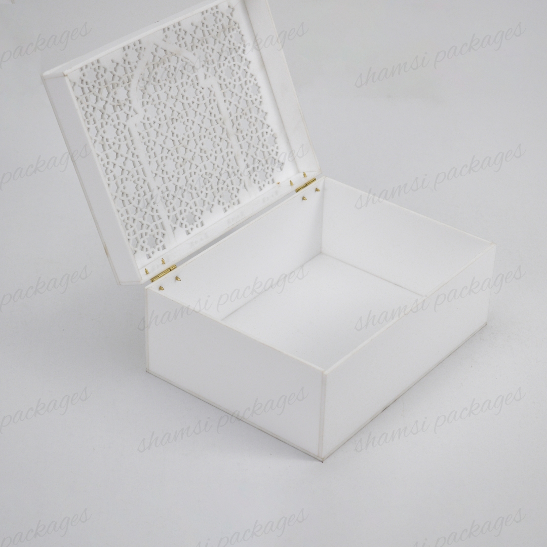 Present your gifts with unmatched elegance using our Premium Acrylic Luxury Hook Box, meticulously crafted to enhance every special moment. Available in two timeless colors — classic Black and pristine White — this box is designed to complement any theme or occasion. Its surface features an intricate laser-cut textured pattern, adding depth, sophistication, and a truly luxurious character to its design.This fully enclosed acrylic box offers a premium, refined look, perfect for gifts where elegance and a touch of mystery matter. With two different size options, it provides versatile space for presenting Hajj & Umrah Tabarruk, jewelry, sweet items, deluxe gifts, wedding invitations, and cherished keepsakes with exceptional style.Built with durability in mind, the box includes a secure hook-style locking system that ensures safe and stable closure. Its unique craftsmanship and premium finish make it an ideal addition to both your Acrylic Hook Box and Acrylic Luxury Box categories, bringing together modern elegance, durability, and high-end presentation in one refined design.
