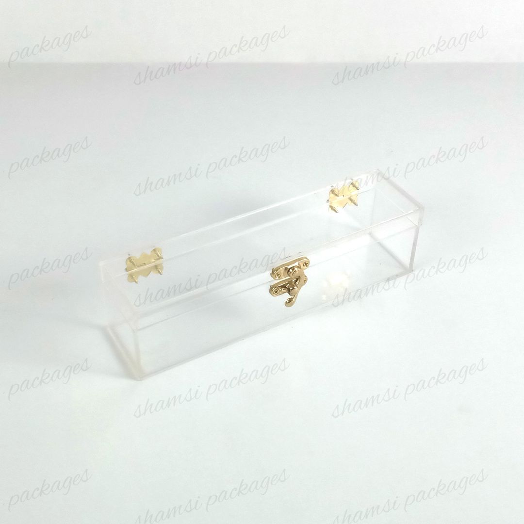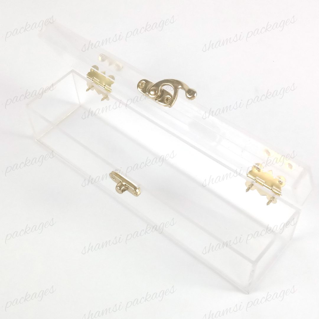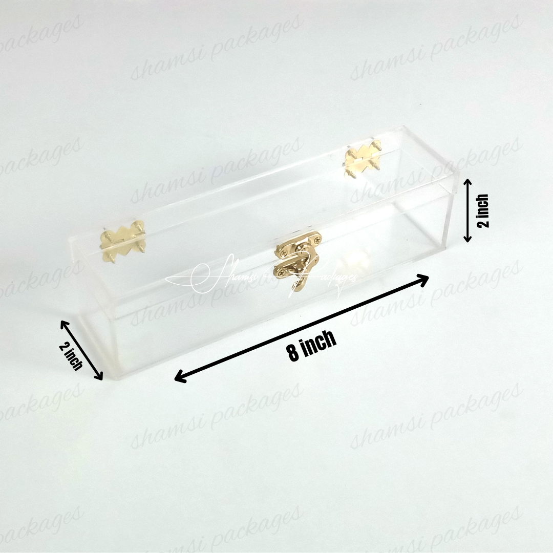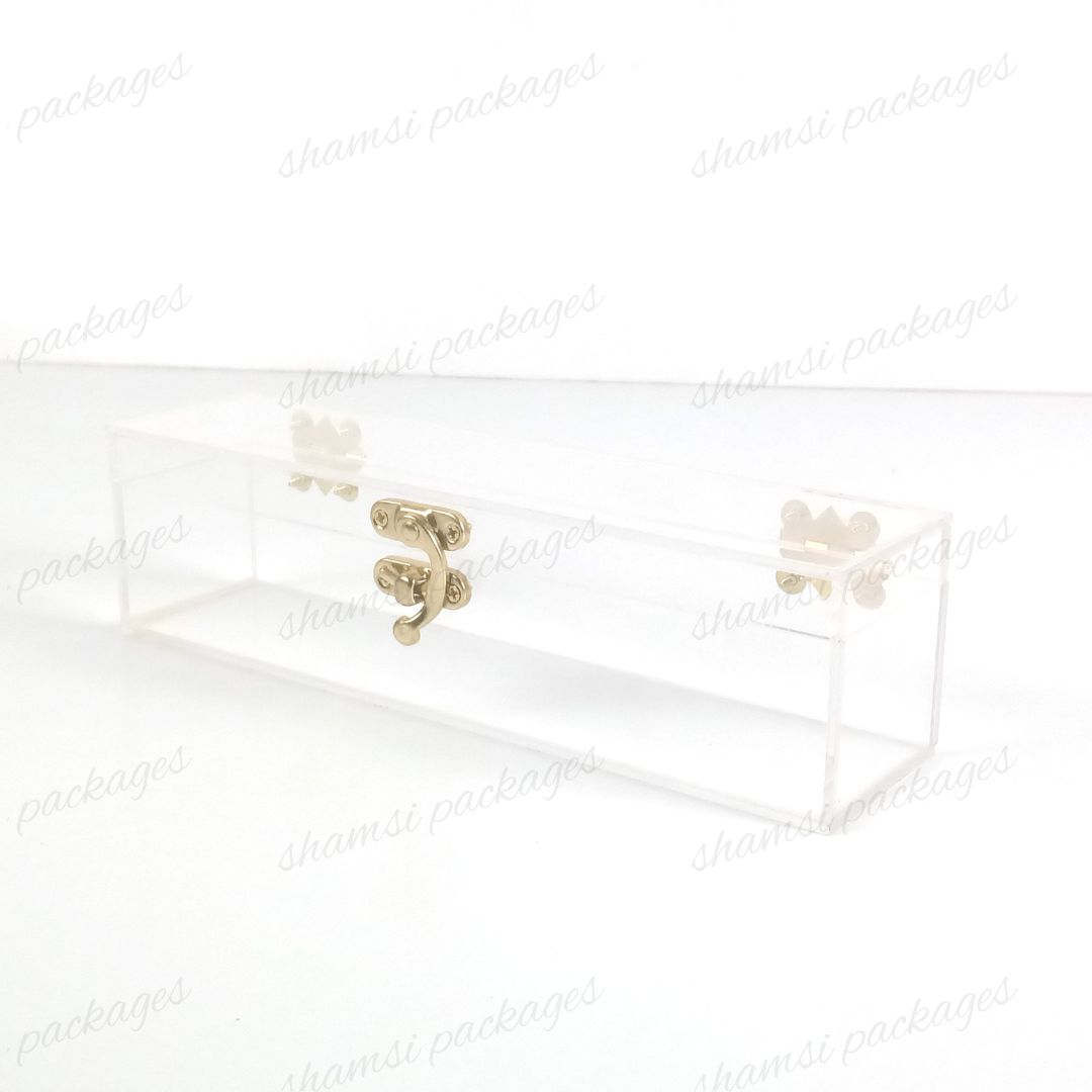 Showcase your most cherished small gifts with confidence and elegance. Our Small Acrylic Hook Box is the perfect solution for presenting items with a secure and unique design. This compact box features an innovative closure system: an anker hook at the front securely fastens to two back locks, providing both a reliable seal and a modern touch.Its perfectly sized interior is ideal for special items like Umrah Tabarruk, small gifts such as watches, jewelry, or any other treasured keepsake. Crafted from premium, crystal-clear acrylic, this box offers a stunning full-view display that ensures your gifts are beautifully presented and well-protected.Often used as an elegant way to invite relatives to weddings and other special ceremonies, this box adds a refined and memorable touch to every occasion.